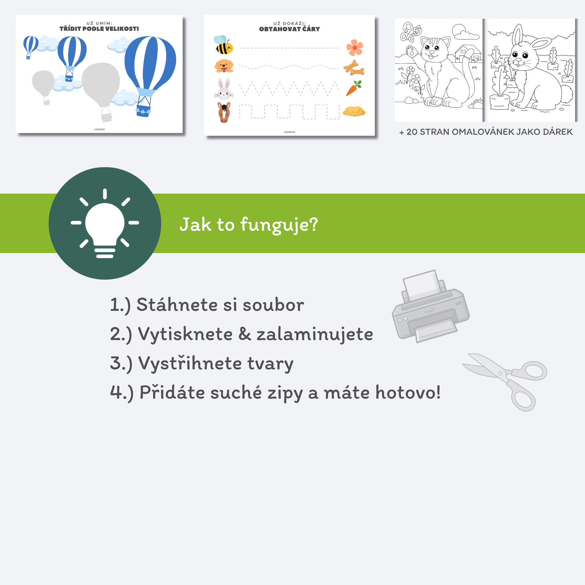 Pracovní listy jsou pro vás k dispozici ihned ke stažení ve formátu PDF. Vy si je můžete vytisknout, zalaminovat a dokončit pro své děti sami.